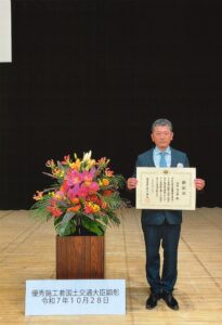先日、弊社社員の西村部長が国土交通大臣から優秀施工者として表彰されました。
